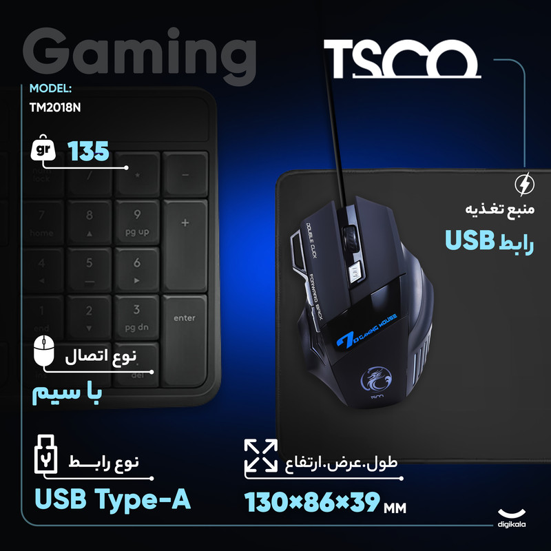 محصولی که در این قسمت مشاهده میکنید یکی از ماوسهای پیشرفتهی شرکت تسکو است. این ماوس که 7 دکمه مجهز شده است برای اجرای بازیهای کامپیوتری و کنترل مولتیمدیا بسیار مناسب است. با توجه به قابلیت تنظیم دقت ماوس تا 3200 dpi میتوان گفت که از این محصول برای اجرای بازیهای کامپیوتری ایدهآل است. نوع حسگر این محصول بهصورت نوری و یا اپتیکال است که دقت بسیار بالایی را به ارمغان میآورد. طول کابل این محصول بهصورت استاندارد بوده و به 1.5 متر میرسد همچنین پوشش کابل از نوع کتان است که مقاوم آن را در طول زمان و طی استفادهی طولانیمدت بالا میبرد. برای کلیدهای ماوس میزان 5 میلیون کلیک توسط شرکت سازنده عنوان شده که نشان از مقاومت بالای محصول دارد. برای اتصال دستگاه به رایانه بایستی از درگاه استاندارد USB استفاده کنید که در تمامی کامپیوترهای امروزی یافت میشود. شرکت سازنده این محصول را از مدلهای مخصوص بازی خود معرفی کرده است.