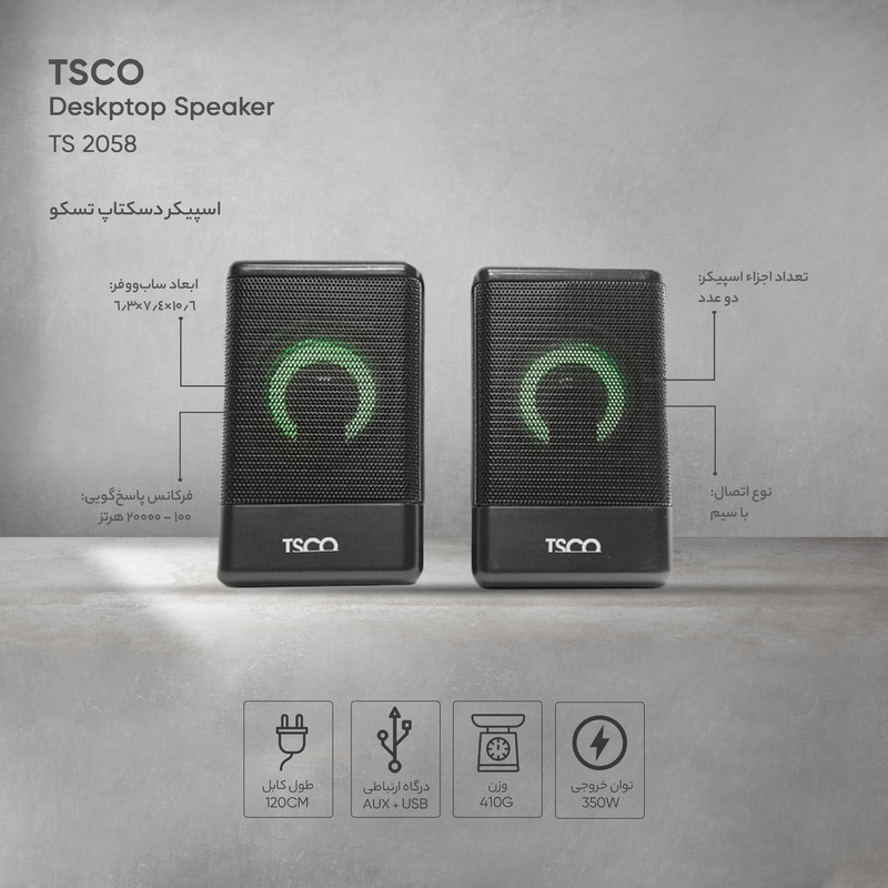 گوش دادن به موسیقی حس آرامش را در شما تقویت میکند. موسیقی هنری است که از دیرباز با زندگی ما آمیخته شده است. برای گوش دادن به موسیقی باید ابزار مناسب در اختیار ما باشد. اسپیکر لپ تاپی TSCO مدل «TS 2058» مناسب برای کامپیوتر و لپ تاپ است. امکان اتصال از طریق پورت USB و جک 3.5 میلیمتری برای این محصول وجود دارد و به یاری فرکانس پاسخگویی 100 هرتز تا 20 کیلوهرتزی، میتواند صداهایی که برای گوش انسان قابل شنیده شدن است را پخش کند.این اسپیکر با داشتن ظاهر زیبا در کنار کیفیت مطلوب خود گزینه مناسبی برای کافه، رستوران و سالن کنفرانس و... است. توان کل این محصول 350 وات است که صدای شفاف و رضایت بخش تولید میکند. ابعاد و وزن مناسب این محصول سبب شده تا برای جابهجایی هیچ مشکلی برای کاربر بههمراه نداشته باشد. نورپردازی RGB در نظر گرفته شده برای این محصول هم سبب شده تا جلوه ظاهری بسیار جذابی داشته باشد.