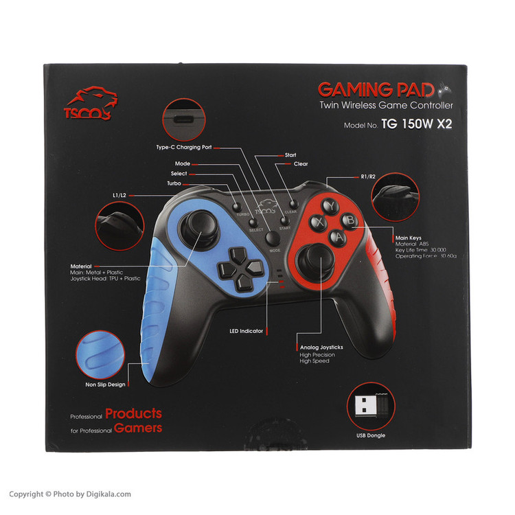 ابعاد دسته TG 150W X2 در حدود 160x110x55 میلیمتر بوده و وزن این دستهها در مجموع 470 گرم خواهد بود. تعداد کلیدهای آن 19 عدد است و طول عمر کلیدها 30000 خواهد بود. نوع اتصال این دسته بیسیم بوده و باتری دارد. باتری این دسته لیتیومی بوده و 400 میلی آمپر ساعت ظرفیت دارد. طول عمر باتری در این دستهها 8 تا 10 ساعت خواهد بود. ضمن اینکه شارژ از طریق USB Type C صورت میگیرد. جنس این دسته تسکو پلاستیکی است. این دستههای بازی تسکو با PC X- Input D- Input - PS3 - Android سازگار است. دسته بازی تسکو مدل TG 150W X2 با ویبره برای حس کردن هیجان بیشتر در بازیهای شما طراحی شده است. با این دسته بازی، دقت بالایی در بازی خود تجربه خواهید کرد که به شما در بازیهایی مانند بازیهای شوتر و اکشن بسیار کمک خواهد کرد.