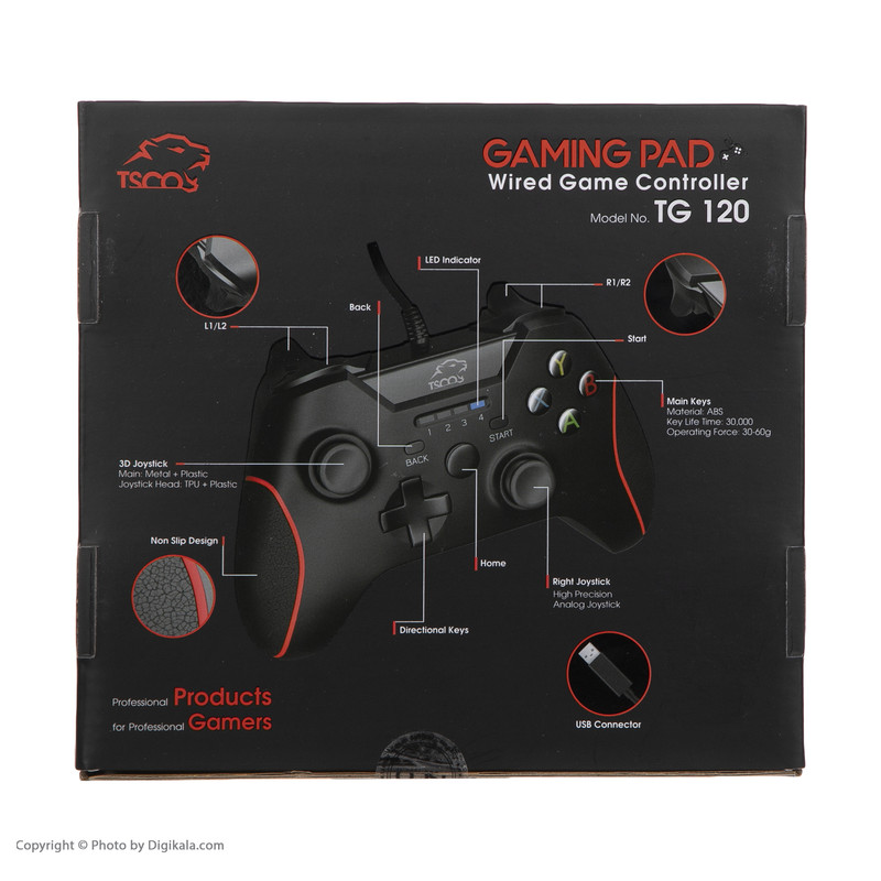 دسته بازی تسکو مدل TG 120 یکی از دستههای بازی با کیفیت و اقتصادی ایرانی است که با توجه به ویژگیهای خود میتواند گزینهای مناسب برای علاقهمندان به بازیهای ویدویی تلقی شود. این دسته بازی دارای طراحی ارگونومیک و مناسب برای دست است. مواد ساخت این دسته بازی شامل پلاستیک با کیفیت بالا و پدهای انعطاف پذیر است که باعث راحتی و استحکام در برداشتن دسته بازی میشود. این دسته بازی دارای 17 کلید قابل برنامه ریزی است که امکان تنظیم آنها برای بازیهای مختلف را به کاربر میدهد. همچنین دقت و حساسیت بالای این دسته بازی در بازیهای شلیکی، رانندگی و ... بسیار مطلوب است. این دسته بازی با انواع سیستمهای کامپیوتری، لپ تاپها و گوشیها و تبلتهای اندرویدی قابل استفاده است و با اتصال به دستگاه، به صورت خودکار شناخته می شود. این دسته بازی دارای قابلیت اتصال باسیم است.