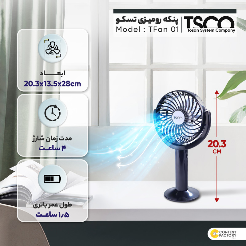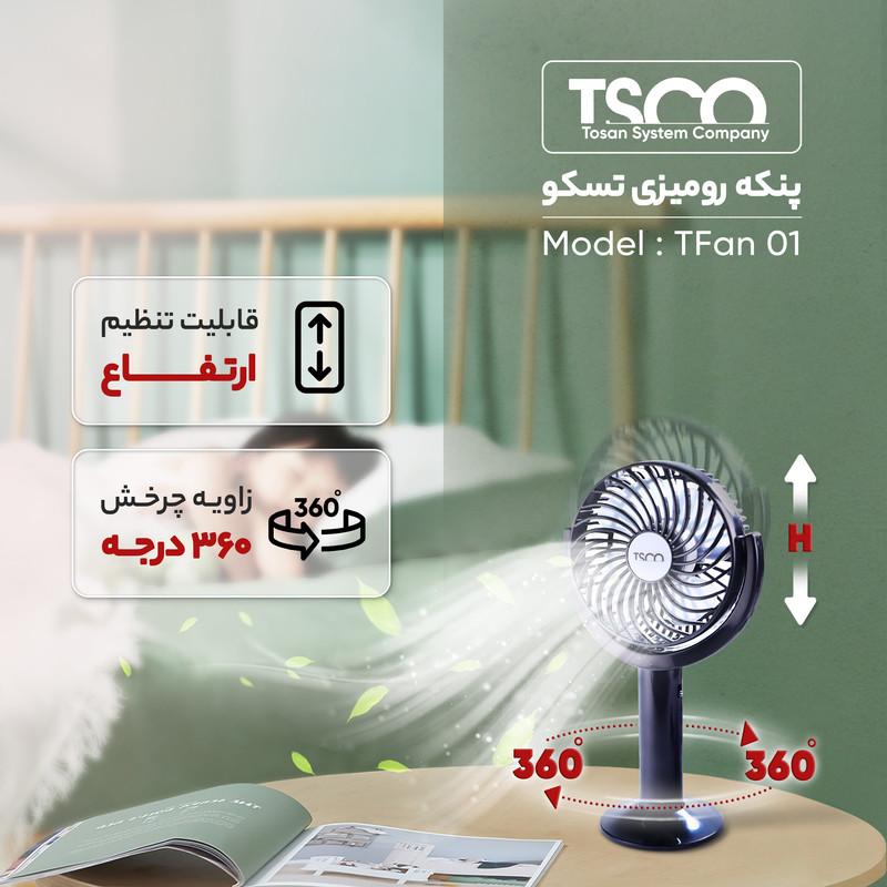 پنکه رومیزی تسکو مدل TFan 01 از جمله ابزارهایی است که به شما کمک میکند تا بتوانید فضای مطبوعی در اتاق یا محل کارتان برای خود بهوجود بیاورید. ابعاداین پنکه درحدود 20.3x13.5x28 سانتیمتر بوده و وزن آن 177 گرم است. این پنکه دارای قابلیت تنظیم ارتفاع بوده و میتوانید به دلخواه آن را تنظیم کنید و در مکانهای مختلف اتاقتان قرار دهید. این پنکه چعار پره بوده و جنس پرههای پنکه از پلاستیک است. این پنکه دارای باتری بوده و ظرفیت باتری آن 1200 میلی آمپر ساعت است. مدت زمان شارژ باتری 4 ساعت خواهد بود و طول عمر باتری 1.5 ساعت است. فن این پنکه دارای دو حالت سرعت است. سرعت فن 4000RPM خواهد بود. همچنین پنکه رومیزی تسکو مدل TFan 01 ولتاژ ورودی DC 5V دارد.
