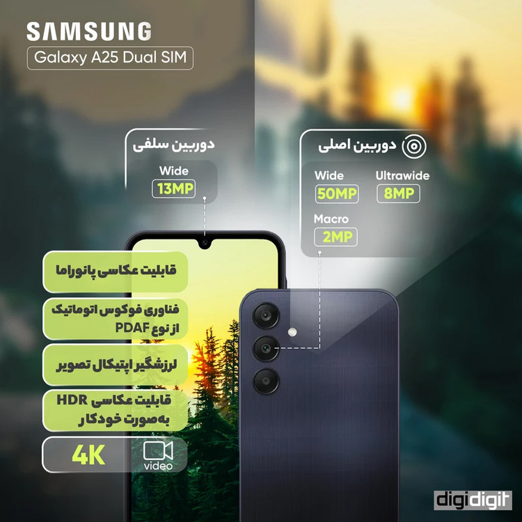 گوشی موبایل سامسونگ مدل Galaxy A25 یکی دیگر از میانردههای اقتصادی سامسونگ است که با توجه به تغییرات کوچک و بزرگ نسبت به نسل قبلی خود میتواند امسال هم انتخاب بسیاری از کاربران باشد. صفحه نمایش باکیفیت، پردازنده استاندارد و بدون لگ و دوربین مناسب نسبت به قیمت مواردی است که میتواند برای خرید این گوشی ترغیب کننده باشد.