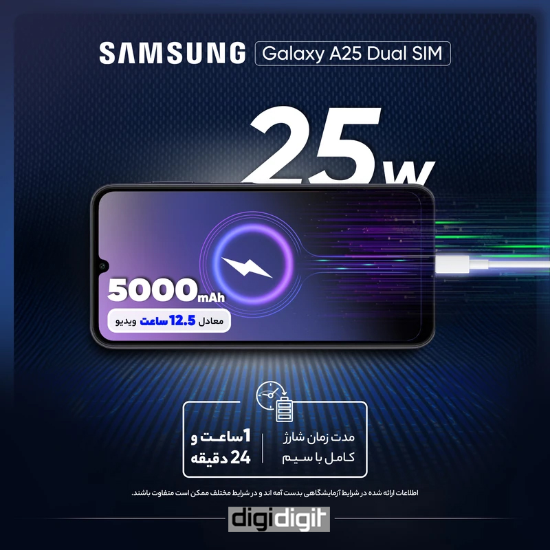 سامسونگ Galaxy A25 دارای تراشه ساخت خود کمپانی یعنی اگزینوس ۱۲۸۰ است که در برخی دیگر از مدلهای گلکسی مانند A53 و A33 به کار رفته است و توانسته عملکرد خوبی را از خود به جای بگذارد. این تراشه با رم شش گیگابایتی ترکیب شده است و عملکردی روان و بدون لگ را از خود به نمایش میگذارد، به طوری که برای انجام بازیهای نه چندان سنگین هم میتوانید روی آن حساب کنید. این گوشی دارای رابط کاربری One UI 6 روی آخرین نسخه اندروید یعنی اندروید ۱۴ است که نیازی به معرفی ندارد و تجربه کاربری بسیار خوبی را در اختیار شما قرار میدهد. طبق گفته کمپانی سامسونگ، این گوشی میتواند تا چهار به روز رسانی اندروید و پنج سال بروزرسانیهای امنیتی را دریافت کند. باید بگوییم حتی در برخی از گوشیهای پرچمدار هم دیده نمیشود و بنابراین تا مدتها میتوانید روی آن حساب باز کنید. مانند بسیاری دیگر از گوشیهای نسل جدید، این مدل هم از باتری با ظرفیت ۵۰۰۰ میلیآمپرساعت بهره میبرد و از شارژ سوپر فست با توان ۲۵ وات پشتیبانی میکند.
