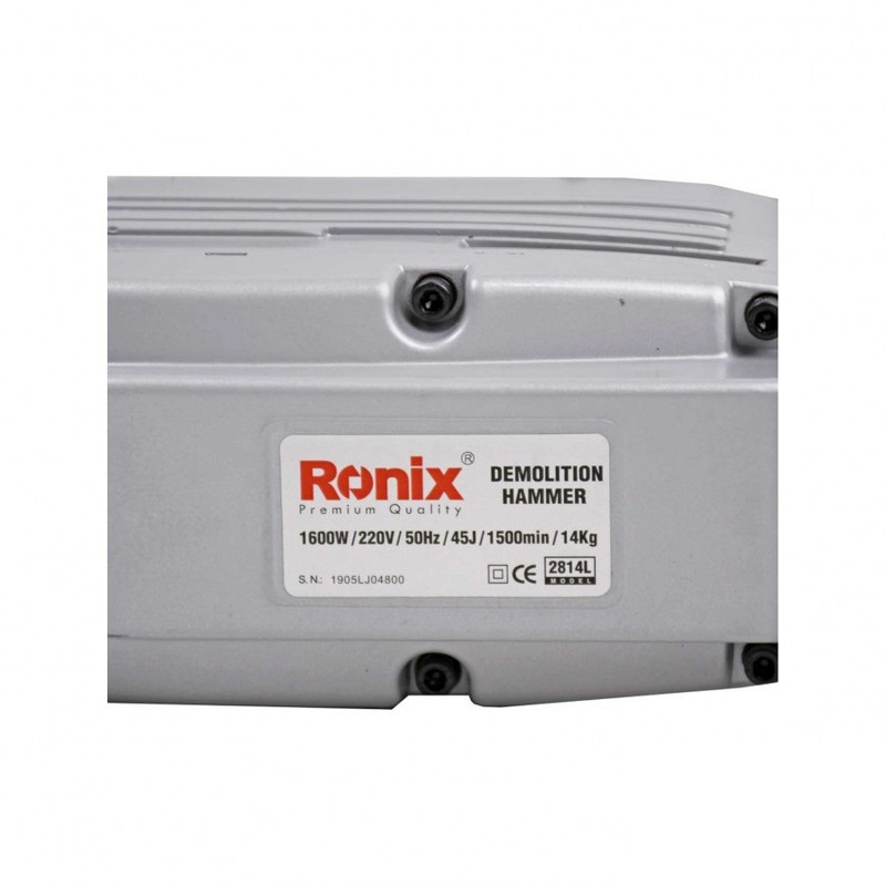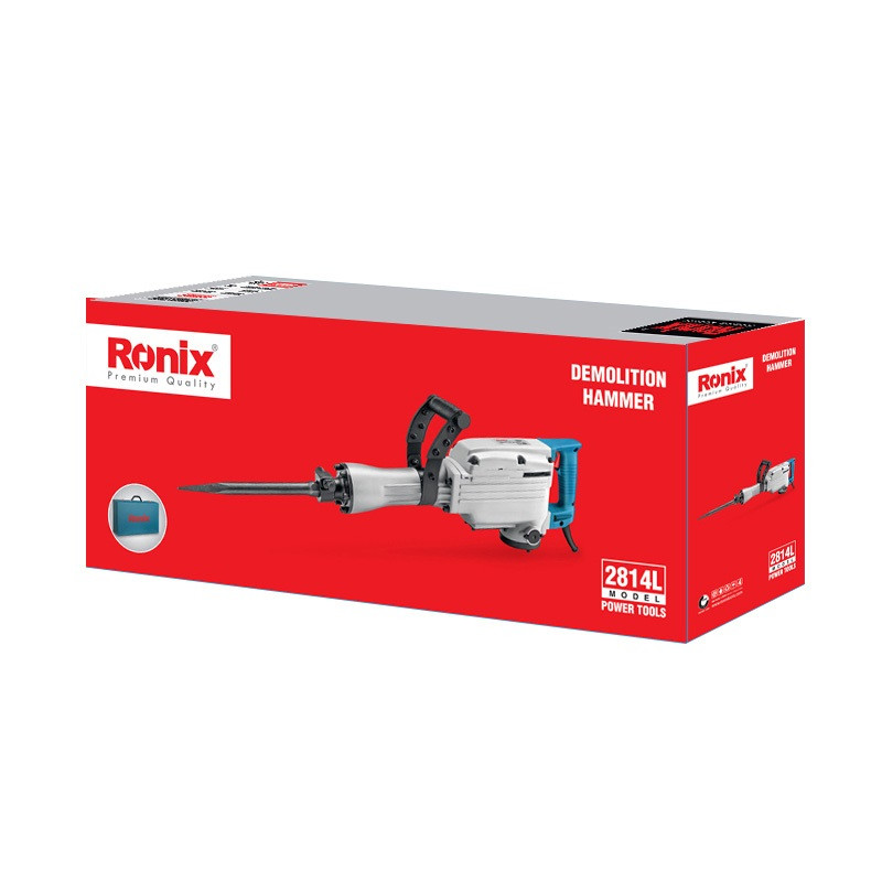 محصول پیش روی شما چکش تخریب 14 کیلوی رونیکس میباشد. این چکش تخریب با کیفیت بسیار مطلوب و تحت استانداردهای روز دنیا تحت عنوان مدل 2814L به بازار عرضه شده است. منبع تغذیه این ابزار برق بوده و ولتاژ آن بین 220 تا 240 ولت است. وزن این دستگاه 14 کیلوگرم و توان آن 1600 وات است. قدرت موتور بالا و وزن سنگین این محصول باعث شده است تا در دسته ابزار آلات صنعتی قرار بگیرد و مصرف آن برای انواع پروژههای صنعتی مناسب باشد. قدرت بسیار زیاد موتور این محصول باعث شده است تا چکش دارای قدرت بسیار زیادی جهت تخریب داشته باشد، توان ضربه این چکش 45 ژول است. این چکش تخریب که با سیستم روغنی طراحی گردیده است به کمک آچارهای همراه آن به سادگی توسط کاربر قابل سرویس کاریست که شامل روغنکاری دوره ای و تعویض ذغال میباشد. در این پیکور برقی رونیکس از بلبرینگهای ضد غبار و اورینگ و پکینگهای مقاوم در برابر حرارت جهت بالا بردن عمر دستگاه استفاده کرده است. 2814L مجهز به سنبههای میانی، ضربه زن، شاتون و سیلندر ساخته شده از بهترین آلیاژ و مواد اولیه است که نتیجتا دوام و عمر دستگاه را بالا خواهد برد.