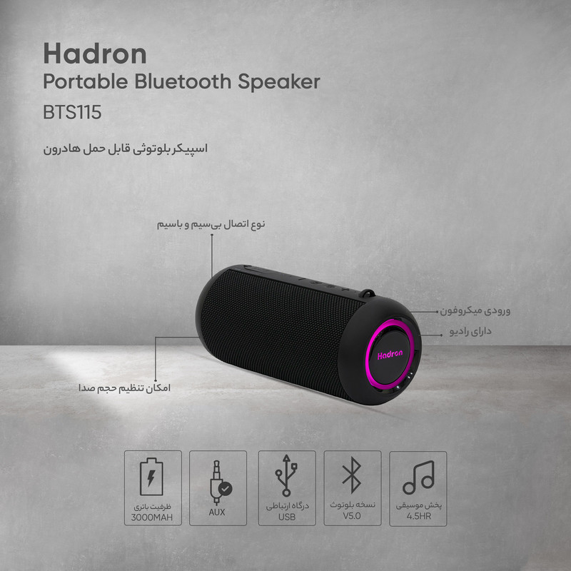 اسپیکر قابل حمل Hadron مدل BTS115 ، همراه با گارانتی شرکت هادرون توان ارائه میشود. این اسپیکر از طریق بلوتوث نسل 5 و یا کابل AUX ، به تلفن همراه هوشمند و سایر پخشکنندههای صوتی دیگر متصل میشود. حجم صدای خوب علاوه بر کیفیت صدای مطلوب به همراه ابعاد مناسب, این محصول را برای استفاده در انواع شرایط مختلف مناسب میسازد. همچنین این محصول از قابلیت پخش استریو توسط اتصال بیسیم دو اسپیکر به یک دیگر یا تکنولوژی TWS پشتیبانی میکند. این محصول به دو رادیاتور تقویت بیس و نورپردازی چند حالته رنگی مجهز شده است. با وجود باتری 3000 میلیآمپری قابلیت این را دارد که 4.5 ساعت به موسیقی گوش دهید و از کیفیت صدای مطلوب آن لذت ببرید.