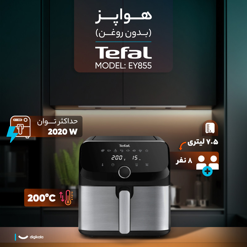 هواپز تفال مدل EY855 با ظرفیت ۷.۵ لیتر، مناسب برای خانوادههای پرجمعیت طراحی شده است. توان ۲۰۲۰ وات و قابلیت تنظیم دما تا ۲۰۰ درجه سانتیگراد، آن را به گزینهای ایدهآل برای سرخکردن، گریل و پخت انواع غذاها بدون نیاز به روغن تبدیل کرده است.