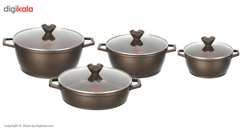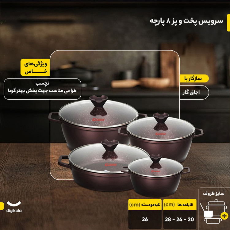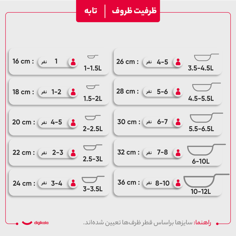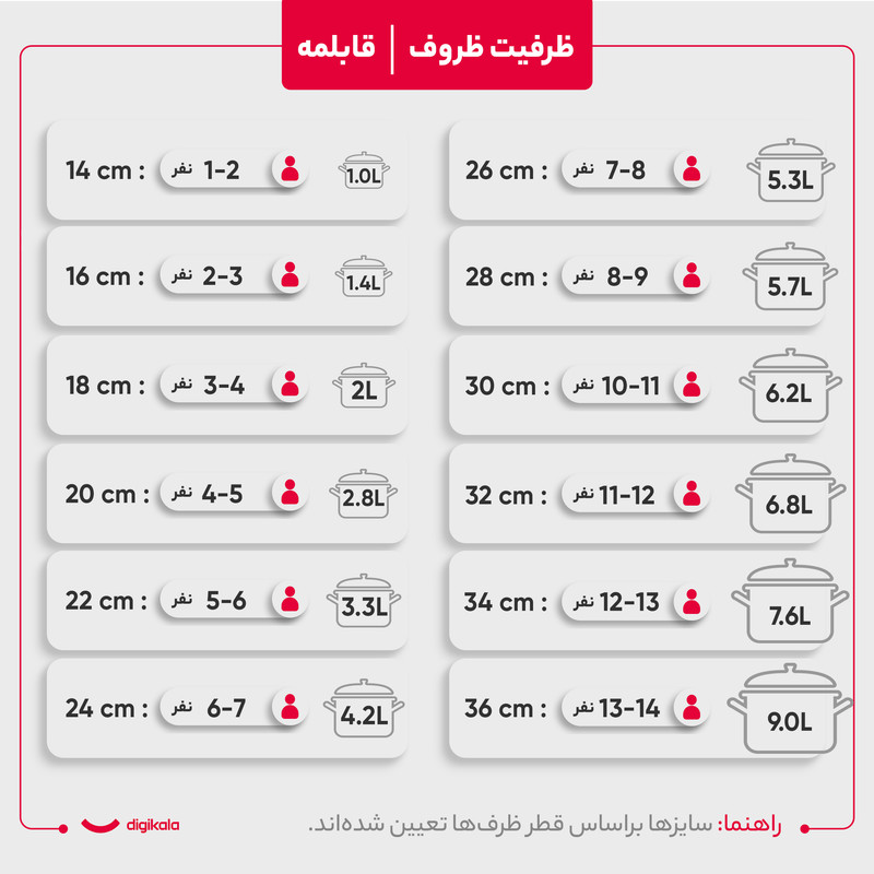 وزن ظروف: قابلمه سایز ۲۸: ۱۹۸۵ گرم، قابلمه سایز ۲۴: ۱۷۴۵ گرم، تابه سایز ۲۶: ۱۸۵۵ گرم