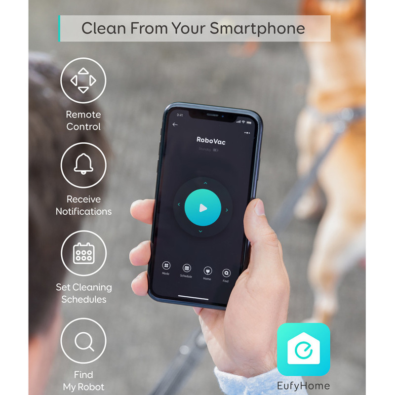 2 - به وسیله اپلیکیشن RoboVac از طریق موبایل شما می توانید جاور برقی رباتی یوفی را روشن کرده و آن را از دور کنترل کنید. همچنین می توانید روشهای تمیز کردن را تغییر داده و برنامه زمانی را تنظیم کنید. می توانید برنامه را طوری برای ربات تعریف کنید که در زمان خروجتان از منزل شروع به کار کرده و پیش از بازگشت شما پاکسازی را تمام کرده باشد.