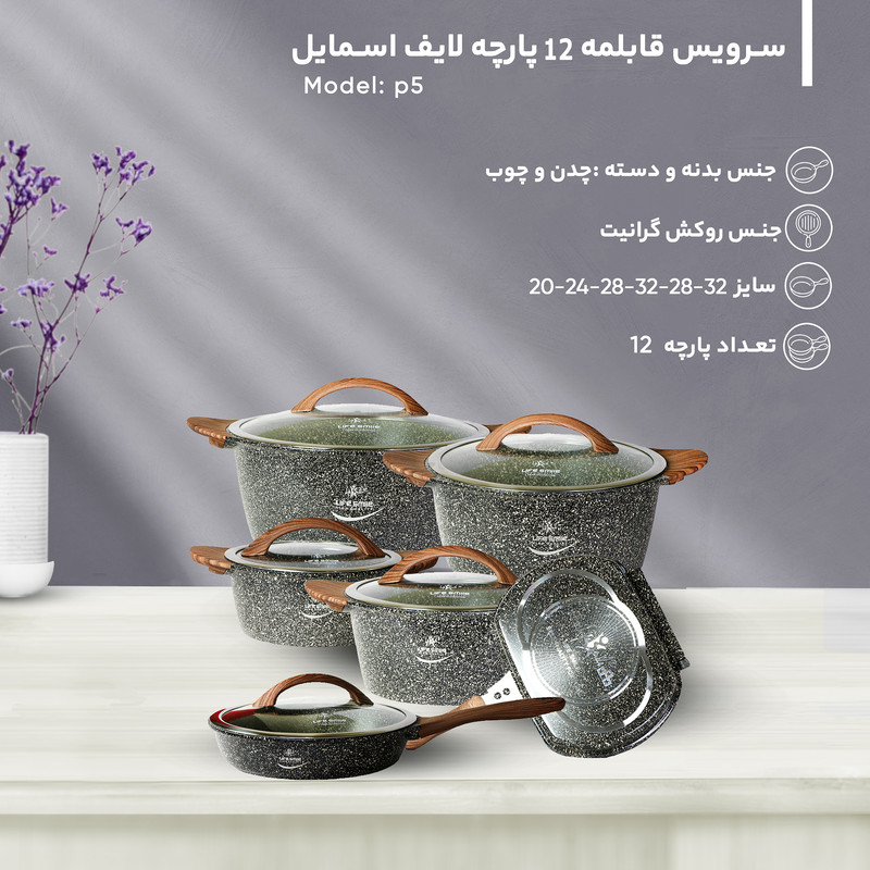 گرانیت به کار رفته در سرویس لایف اسمایل بسیار بهداشتی تر از تفلون و مقاوم تر از سرامیک است. سرویس قابلمه لایف اسمایل نیز از جنس گرانیت است که با فناوری نانو ساخته شده و در برابر ضربهها بسیار مقاوم است. به علت ساختار قوی که در پوشش بیرون و درون آن است به هیچ عنوان خط و خشی برنمیدارد. دستههای این سرویس کاملا نسوز بوده که متصل به بدنه آن است و طی فناوریهایی که در ساخت آن به کار رفته, گرما به هیچ عنوان به دستهها نمیرسد.