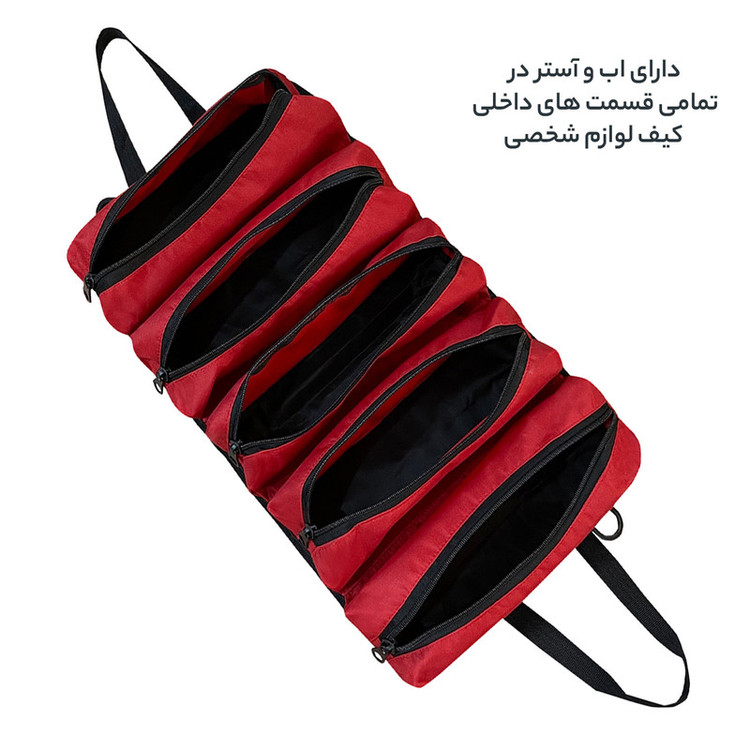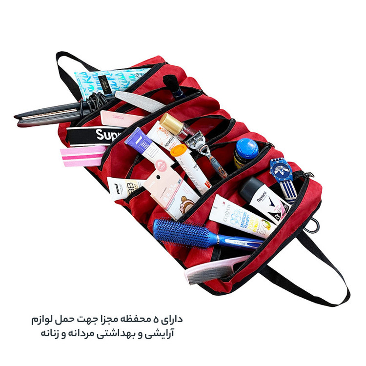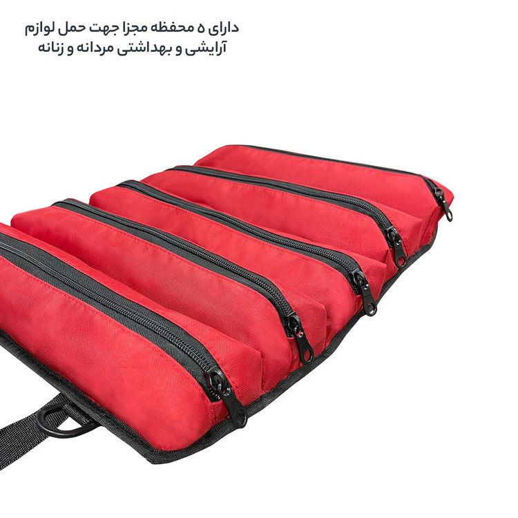 دارای 5 محفظه زیپی مجزا جهت استفاده به عنوان کیف لوازم شخصی مردانه و زنانه و قابل استفاده به عنوان کیف ابزار