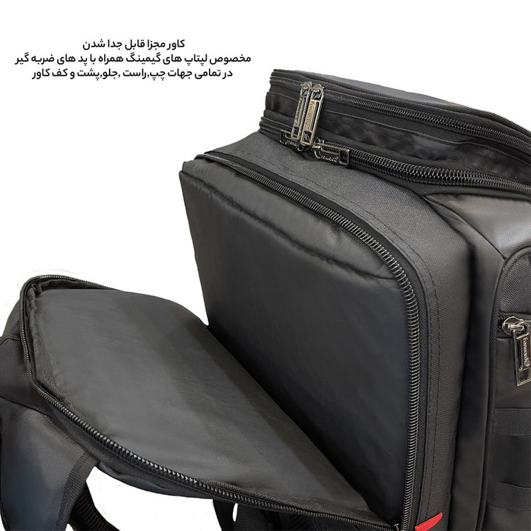 جیب بیرونی , جیب خودکار , جیب داخلی , دارای یک محفظه اصلی , محفظه نگهداری اسناد , محفظه نگهداری لپتاپ , آلبوم کارت شناسایی , جیب سکه , جیب سیم کارت , جیب طولی اسکناس , جیب کارت اعتباری , جیب کارت ویزیت , محفظه نگهداری پاسپورت , محفظه نگهداری کلید