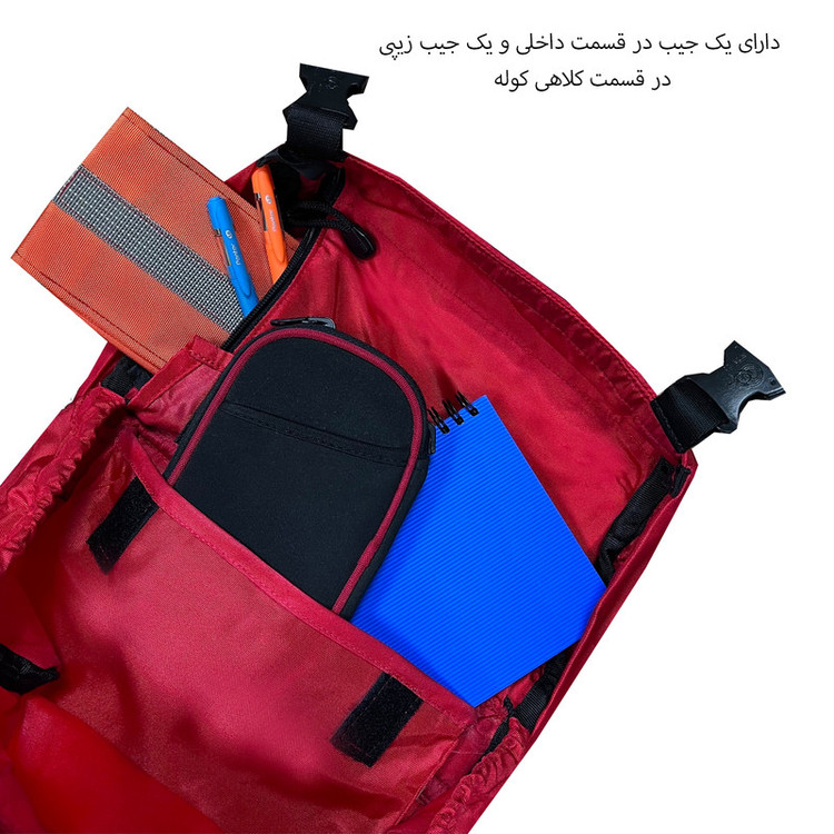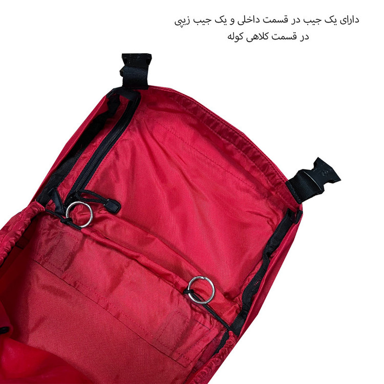 دارای یک محفظه اصلی جهت قرار دادن وسایل بزرگ دارای یک جیب در قسمت داخلی دارای یک جیب زیپی مخفی در قسمت پشتی کلاهی دارای یک جیب زیپی در قسمت داخلی کلاهی دارای یک جیب زیپی در قسمت جلویی کوله دارای دو جیب کشی در دو طرف کوله