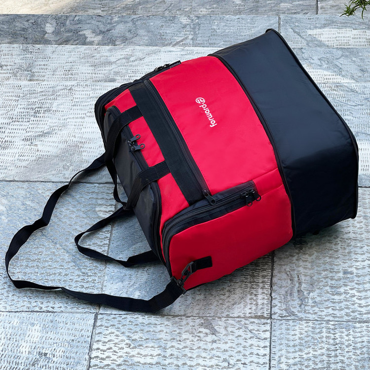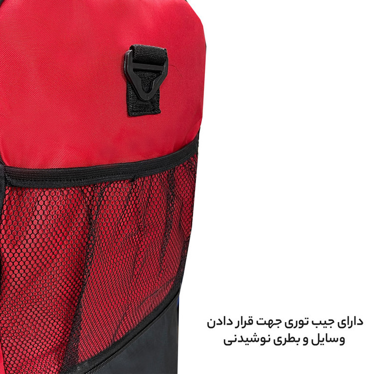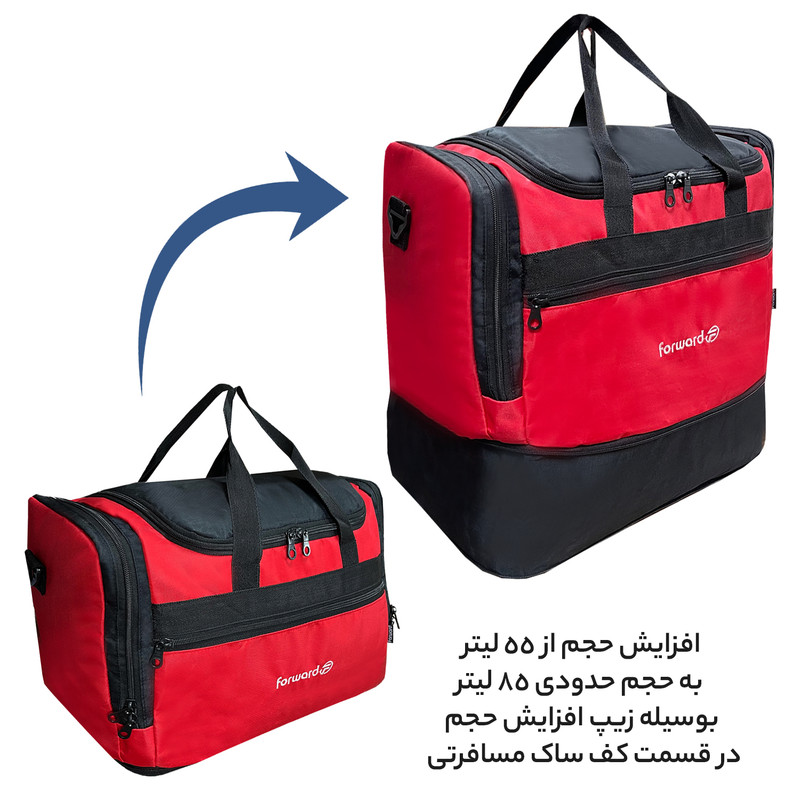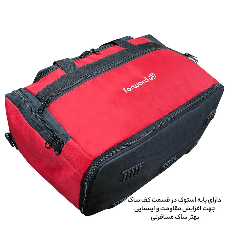 دارای یک بند بلند قابل تنظیم و قابل جدا شدن جهت حمل به صورت دوشی دارای ابر و آستر داخلی در تمامی قسمت های ساک دارای 5 عدد پایه استوک در قسمت کف ساک سفری جهت افزایش ایستایی و مقاومت ساک دارای جنس بدنه ضد آب و قابل شست و شو