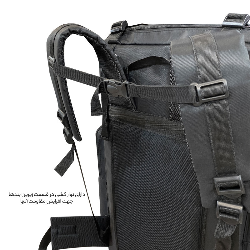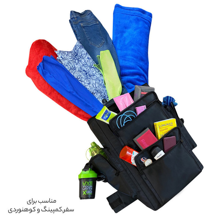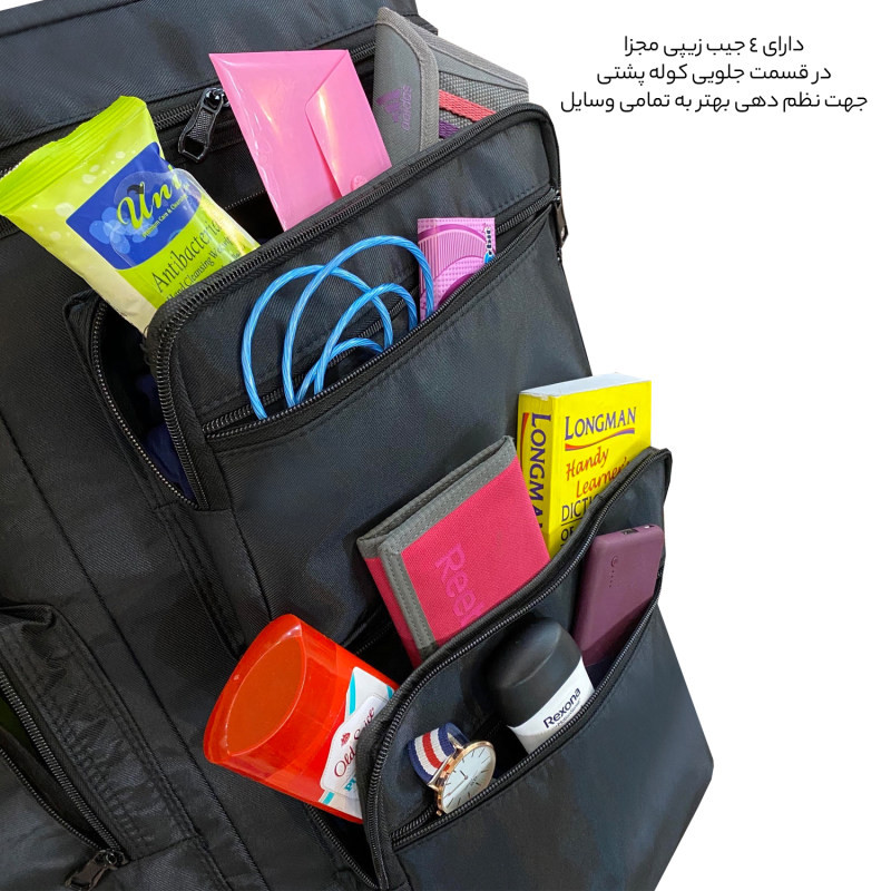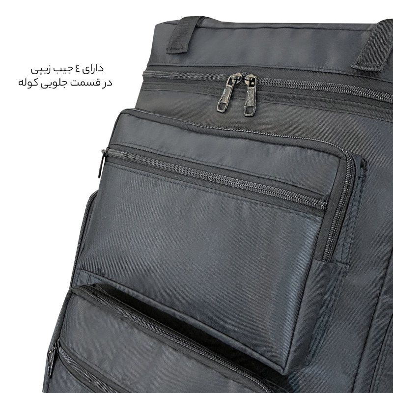 دارای یک جیب زیپی اصلی دارای یک جیب زیپی در قسمت بالایی دارای دو جیب زیپی در دو طرف کوله و چهار جیب زیپی در قسمت جلوی کوله دارای دو جیب زیپی بزرگ در دو طرف کوله جهت قرار دادن وسایل و یا بطری نوشیدنی تا 1.5 لیتری