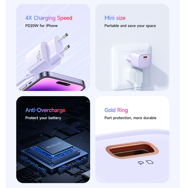 شارژر دیواری ۲۰ وات مکدودو مدل CH-402 یک محصول جمعوجور و کارآمد برای شارژ سریع انواع گوشیها و تبلتها است. این شارژر با وزن ۵۲ گرم و بدنهای از جنس پلیکربنات مقاوم طراحی شده و استفاده از آن در خانه، محل کار یا سفر بسیار آسان است. اتصال شارژر به منبع برق از طریق دوشاخه استاندارد ایران انجام میشود و نیاز به تجهیزات جانبی اضافی ندارد.