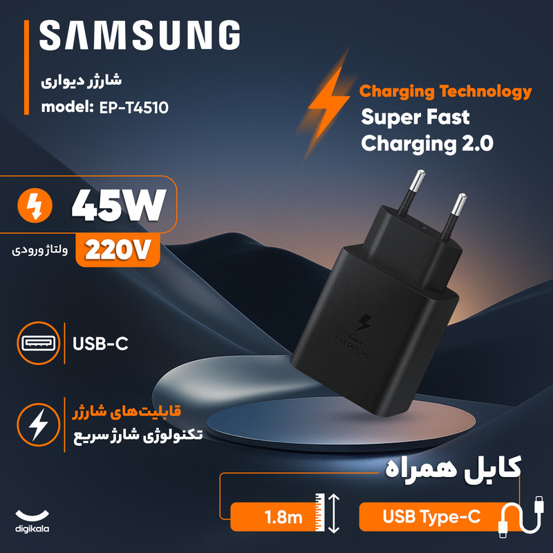 با ترکیب توان بالا، تکنولوژی شارژ سریع، طراحی مقاوم و سازگاری گسترده با دستگاهها، شارژر دیواری سامسونگ ۴۵ وات مدل EP-T4510 انتخابی مطمئن و کارآمد برای کاربران حرفهای و کسانی است که نیاز به شارژ سریع و ایمن دارند.
