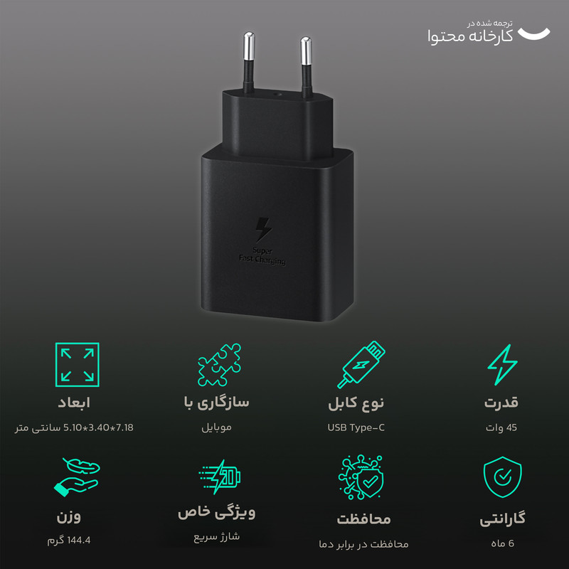 شارژر دیواری ۴۵ وات سامسونگ مدل EP-T4510 یک شارژر حرفهای و با کارایی بالا است که برای گوشیهای هوشمند و تبلتهای سامسونگ و دیگر دستگاههای سازگار با USB Type-C طراحی شده است. این شارژر با وزن ۱۲۳ گرم و بدنهای از جنس پلاستیک ABS، ترکیبی از دوام، مقاومت در برابر ضربه و سبک بودن را ارائه میدهد. اتصال آن به برق از طریق دوشاخه استاندارد ایران انجام میشود و نیازی به تبدیل ندارد، بنابراین استفاده روزمره در خانه یا محل کار بسیار ساده است.