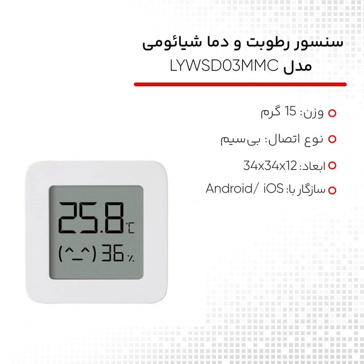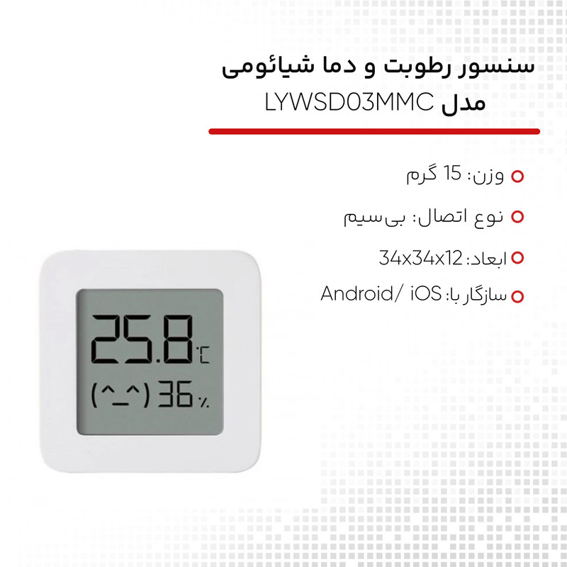 جنس: ABS + PMMA ولتاژ: DC2.5V- -3V باتری: CR2032 اتصال بی سیم: بلوتوث 4.2 BLE دامنه اندازه گیری: 0-60 درجه سانتی گراد دقت نمایش دما: 0.1 درجه سانتی گراد محدوده رطوبت: 0٪ -99٪ RH دقت نمایش رطوبت: 1٪ RH