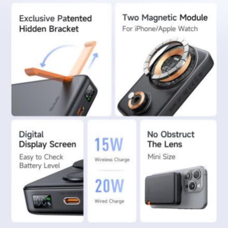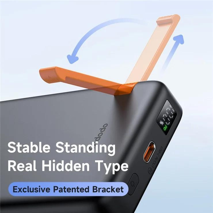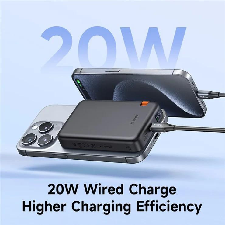 از آنجایی که گوشی تلفن همراه به یکی از ضروریترین وسایل زندگی ما تبدیل شده است، اینکه همیشه شارژ کافی داشته و قابل استفاده باشد، از اهمیت زیادی برخوردار است. پاوربانکها وسایلی هستند که قرار است این امکان را برای ما فراهم کنند. پاوربانک وایرلس 10000 مک دودو Mcdodo MC-146 توان 20 وات با قابلیت شارژ اپل واچ محصولی جدید از شرکت مک دودو بوده که به منظور رفع نیاز شما به شارژ گوشی و تبلت در موقعیتهای مختلف طراحی شده است. با معرفی این محصول همراه ما باشید. طراحی و کیفیت ساخت در ساخت پاوربانک وایرلس Mcdodo MC-146 از پلاستیک بسیار باکیفیت از جنس ABS و PC استفاده شده است که باعث دوام بالای این محصول میشود. ابعاد پاوربانک Mcdodo MC-146 برابر109x69x21 میلی متری بوده و همچنین طراحی چشمنوازی دارد. ابعاد این پاوربانک به صورتی است که به خوبی در پشت گوشی شما قرار میگیرد. وزن 227 گرمی این محصول در مقایسه با بسیاری از رقبا بسیار سبک به حساب میآید. دکمه خاموش و روشن پاوربانک در پایین این پاوربانک قرار گرفته و صفحه LED نشان دهنده میزان باتری پاوربانک هستند. یک استند نیز در بخش پشتی این پاوربانک قرار گرفته که میتوانید به کمک آن این پاوربانک را به صورت افقی یا عمودی قرار دهید. پاوربانک Mcdodo MC-146 چه پورتهایی دارد؟ پاوربانک Mcdodo MC-146 دارای یک پورت Type-c بوده که به کمک آن میتوانید هم پاوربانک خود را شارژ کرده و هم به کمک سیم گوشی تلفن همراه یا تبلت خود را شارژ کنید. قابلیت شارژ وایرلس، امکانی جذاب و مفید به کمک پاوربانک Mcdodo MC-146 این امکان را دارید که گوشی تلفن همراه خود را به صورت وایرلس با توان 15 وات شارژ کنید. به این منظور میتوانید این پاوربانک را به پشت گوشی و یا تبلت خود بچسبانید و به راحتی گوشی تلفن همراه خود را شارژ کنید. چطور پاوربانک وایرلس 10000 مگنتی مک دودو Mcdodo MC-146 توان 20 وات را شارژ کنیم؟ برای شارژ کردن پاوربانک Mcdodo MC-146 میتوانید از کابل Type-c استفاده کنید. در نتیجه با استفاده از انواع کابلهایی که دو سر آن Type-c و یا یک سر USB و یک سر Type-c دارد، استفاده کنید