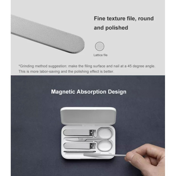 در نگاه اول، یک باکس 65×104×17.3 میلی متری با طراحی مینیمالیستی میبینیم که پس از باز کردن آن 7 ابزار کاربردی برای اصلاح ناخن وجود دارد. با توجه به وزن 104 گرمی و ساختار کوچکی که دارد، یک گزینه مناسب برای حمل روزانه داخل کیف به حساب میآید. خوشبختانه کلیه ابزارهای داخل باکس از استیل ضد زنگ 420/430 ساخته شده اند که دارای استحکام بالا بوده و در استفاده طولانی مدت به هیچ عنوان تغییر رنگ نمیدهد.شاید برایتان جالب باشد اگر بدانید این چند قلم کاربردی، 84 فرآیند پیچیده اصلاح ناخن را انجام میدهد.این ست اصلاح بهداشتی (Xiaomi Mijia Nail Clippers Set) از 5 قلم کاربردی شامل قیچی کوچک، دو ناخنگیر، سوهان و یک قاشق گوش است که همگی جزو پرطرفدارترین و ضروری ابزار آلات بهداشتی هستند. همانطور که اشاره شده، این ست شامل دو ناخنگیر با لبههای صاف و زاویه دار است که برای اصلاح ناخن کاربرد دارد. بافت سوهان ناخن نیز بافتی استاندارد برای جلای ناخن و منحل کردن گوشههای تیز آن دارد.قیچی نیز عمدتا برای اصلاح موهای ابرو و قاشق گوش نیزبرای تمیز کردن مجرای گوش مفید خواهد بود.
