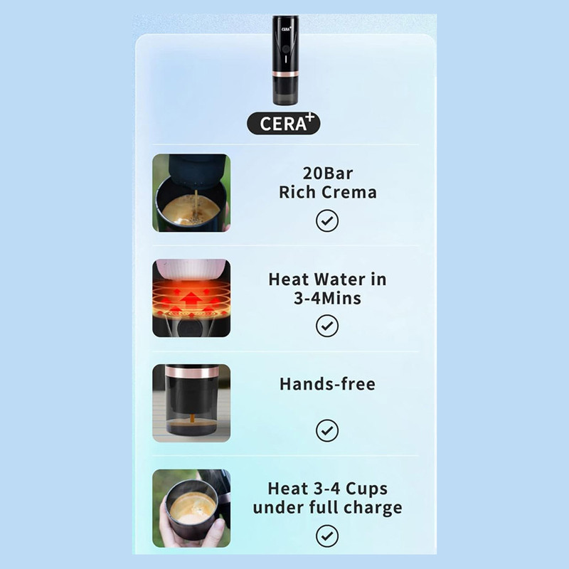 این اسپرسوساز قابل حمل مدل PCM03 با می تواند با فشار ۲۰ بار، کپسول/ قهوه آسیاب شده را استخراج کند و اسپرسو را با طعم و عطر عالی تضمین کند. همانطور که اشاره کردیم، امکان استفاده از کپسول های قهوه نیز مزیتی است که این دستگاه را از دیگر اسپرسو ساز ها متمایز میکند، زیرا با این امکان، میتوانید به سرعت و به راحتی قهوهی مورد نظر خود را تهیه کنید. ظرفیت مخزن اسپرسوساز مدل سرا پلاس 80 میلی لیتر بوده و با این ظرفیت مناسب، به شما امکان میدهد تا چند فنجان قهوه را به صورت پشت سر هم تهیه کنید، بدون اینکه نیاز به تعویض مکرر آب داشته باشید.