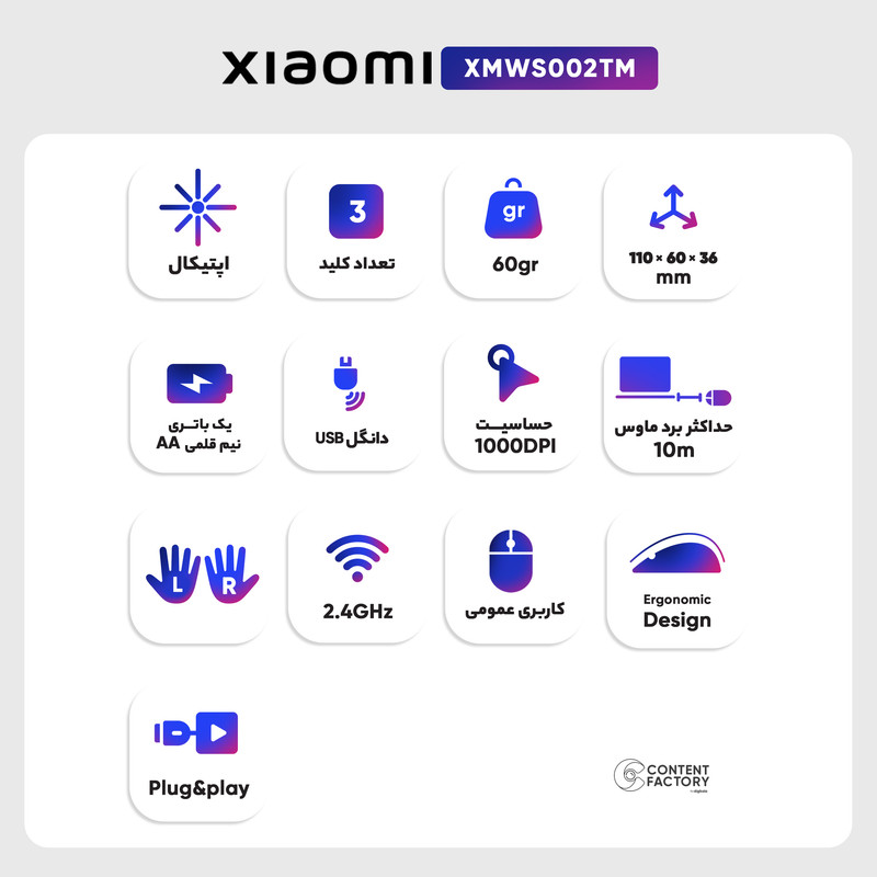 موس وایرلس شیائومی مدل XMWS002TM پیرو تکنولوژی وایرلس است و بدنه ساده و مینیمال آن از مواد اولیه پلاستیک (ABS) تشکیل شده است. وزن آن 120 گرم است و یک راه حل مختصر و مفید برای لپ تاپها، TV Box و تبلتها به حساب میآید. این موس 2.4 گیگاهرتزی ، با وجود دقت 1000dpi، جدا از کارکرد بر روی موس پد استاندارد، عملکرد و رضایت بخشی بر روی سایر سطوح هم دارد. همچنین، میتوان از آن 8 ساعت مستمر بدون ایجاد خستگی زیادی و کاهش عمر مفید آن استفاده کرد. مسئولیت تامین انرژی این موس را یک باتری نیم قلمی AAA بر عهده دارد و اتصال آن به دستگاه مورد نظرتان توسط یک دانگل USB صورت خواهد پذیرفت. این ماوس بدون نياز به نصب هيچ درايور يا نرمافزار خاصی به دستگاهتان کانکت میشود و به راحتی میتوانید از آن استفاده کنید. سرعت انتقال دیتای این ماوس 2.4 گیگاهرتز است که خیال شما را از نقل و انتقال مداوم سیگنالها و افزایش سرعت اجرای دستورها توسط موس راحت خواهد کرد. این موس انتخاب عالی برای افرادی است که کارهای گرافیکی، کارهای روزمره و عمومی با سیستم کامپیوتری خودشان انجام میدهند.